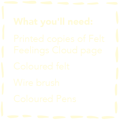 3: Choose a colour for each feeling (e.g. blue for pain, orange for mad etc.). Pull out the coloured felt (using hands or a wire brush) and glue next to the feeling, or, use coloured pens if this is too tricky.